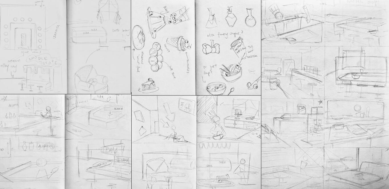 Since I couldn’t settle on a clear scene yet, I decided to explore compositions while sketching my ideas; finding ways to frame a bowl of eyeball soup with me in it, and telling a story thats more than just the objects themselves.