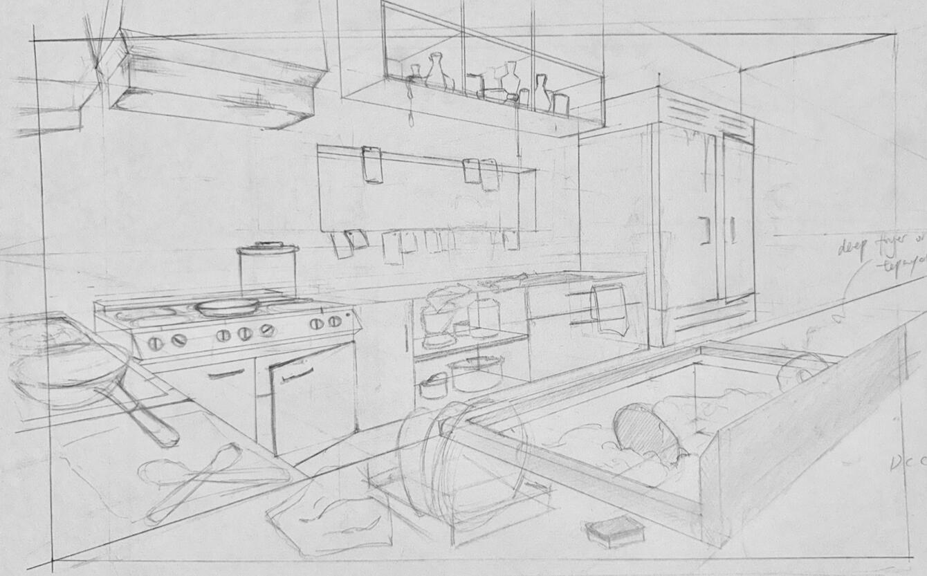 With the help of my lovely tutors (thank you guys for being so patient with my crazy ideas), I decided on a dark kitchen scene.This way, while telling my story and diving into all my gory, disgusting ideas, I could also model tons of clutter and hardware (which I love!)Modeling metal panels is totally my thing, and I couldn’t wait to start on grills and fridges… but first, some planning was in order.
