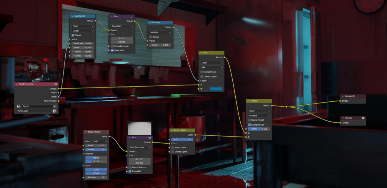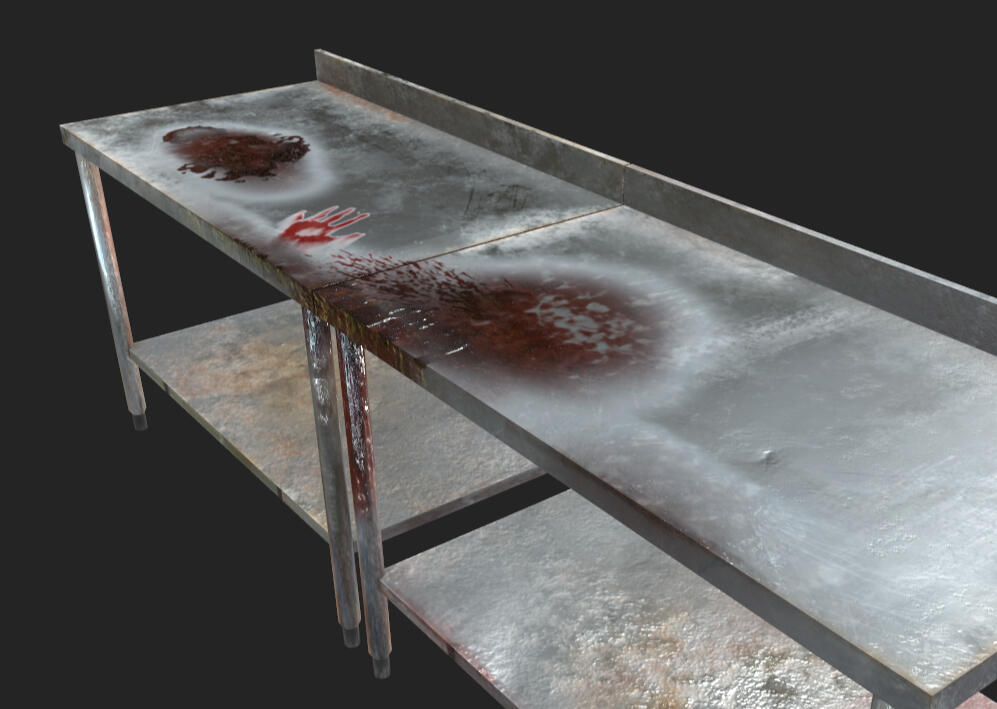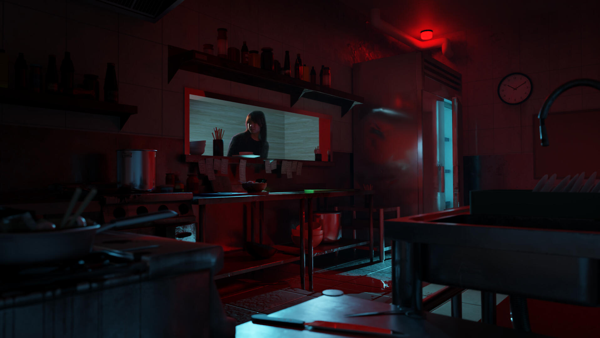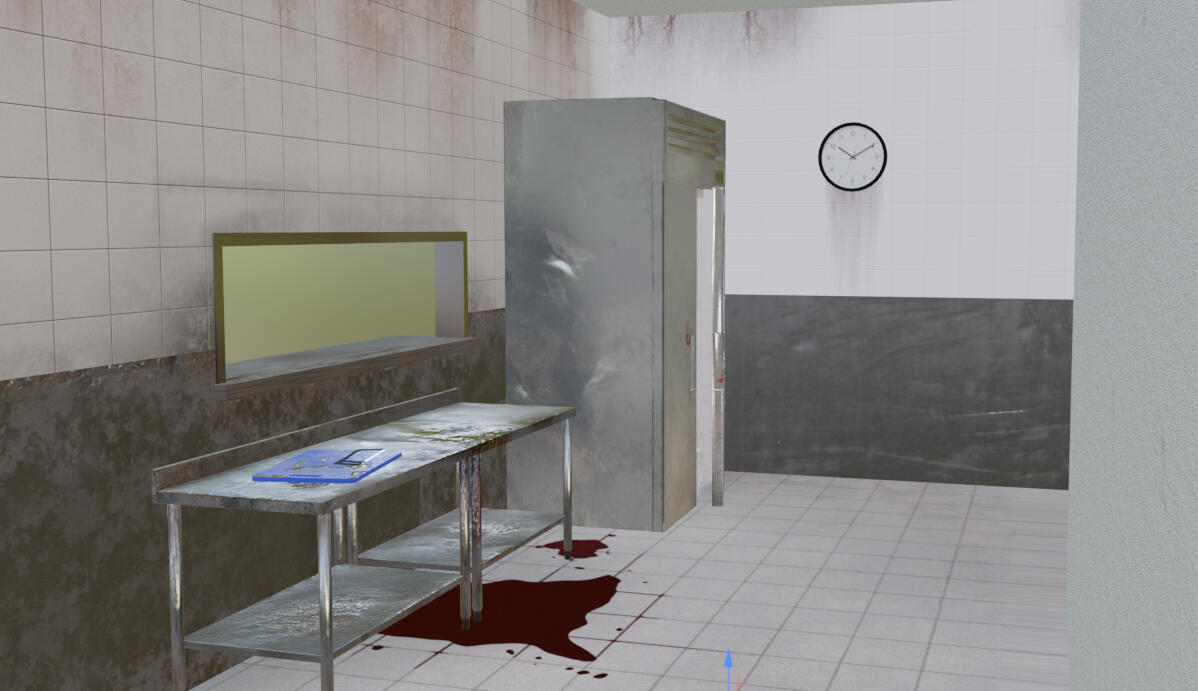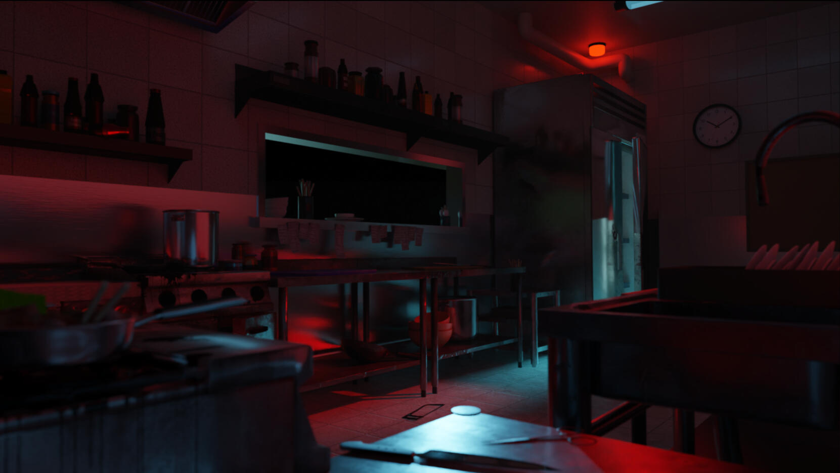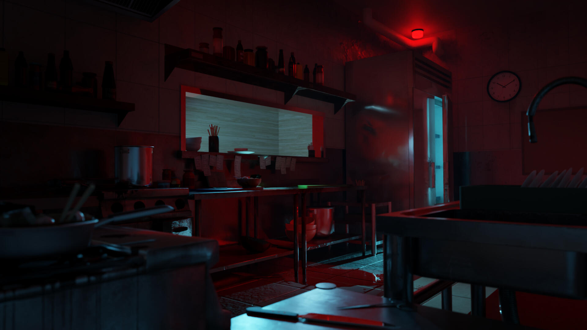 The goal of my scene is to tell a story about a craznoodle shop cook with a bad temper.After hours, he lures rude customers he served during service back into the kitchen, brutally murders them (leaves a mess everywhere), and dissects their bodies, taking out eyeballs and blending their flesh into smoothie to use in the tomorrow’s prize-winning noodle broth.The character is impulsive yet meticulous: he follows recipe books down to the exact gram and uses precise surgical tools (like suture scissors and specific bone saws) but still leaves the kitchen a bloody mess after hours.Below is the atmosphere I wanted to convey: